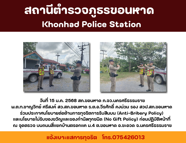 วันที่ 20 ตุลาคม 2567 เวลา 08.20 น. พ.ต.ท.ชาญวิทย์ ศรีสงค์ สว.สภ.ขอนหาด พร้อมด้วยข้าราชการตำรวจ ร้อย
